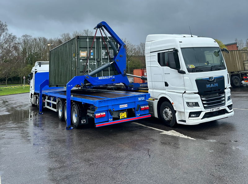 The Megalift self-loading trailer streamlines chassis transfers by effortlessly lifting and repositioning containers between different trailers without the need for cranes or forklifts.